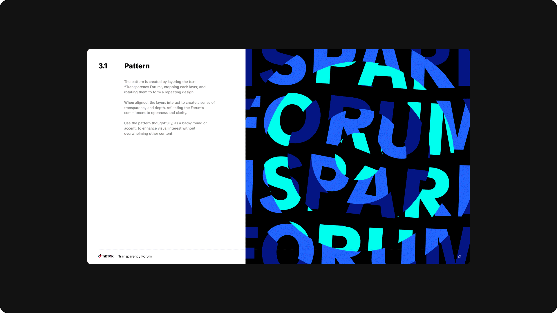 TikTok Transparency Forum is a quarterly event dedicated to addressing trust and safety issues on the app. It brings together TikTok experts and industry voices to discuss the ongoing efforts to make TikTok the safest platform for creative expression. TikTok Transparency forum needed a brand Identity that radiated the feeling of safety and approachability.